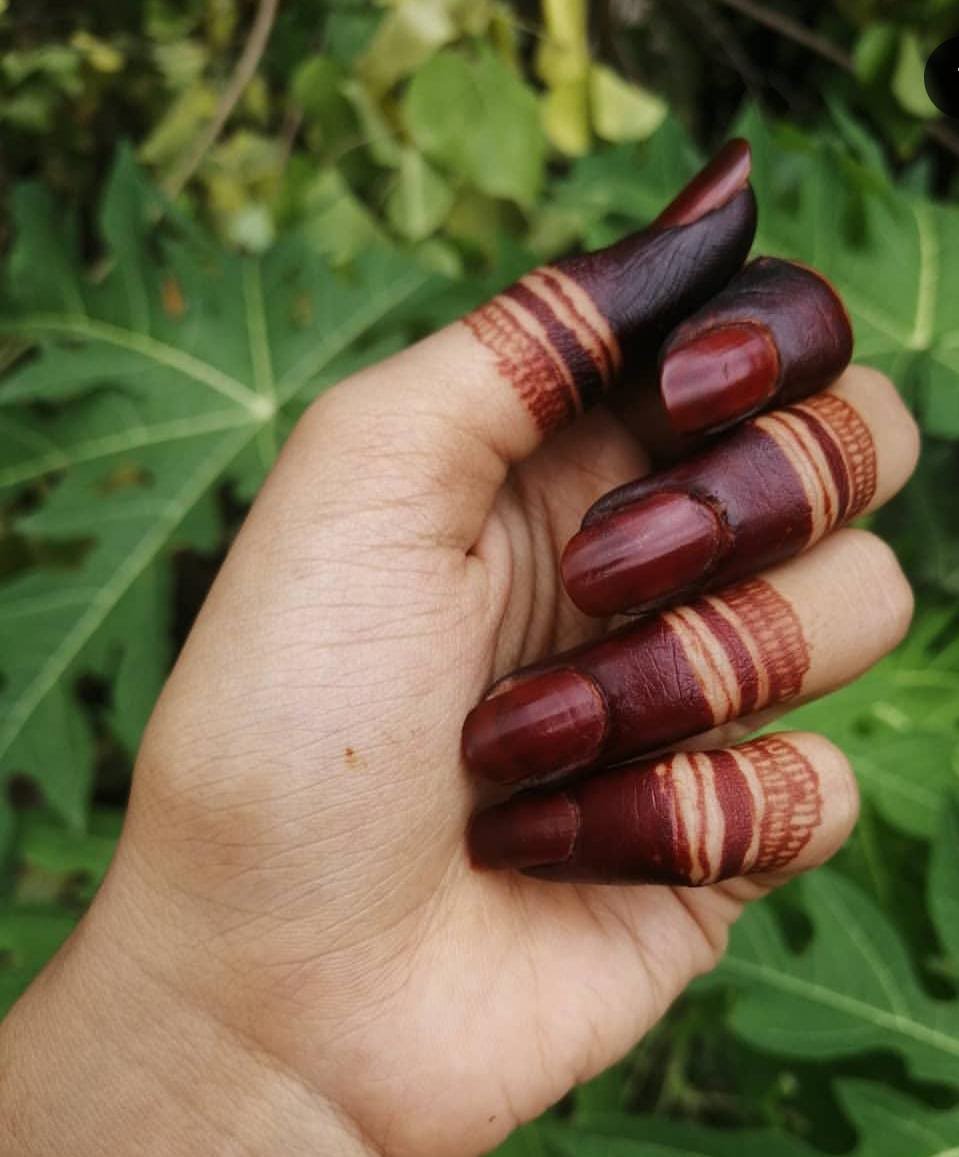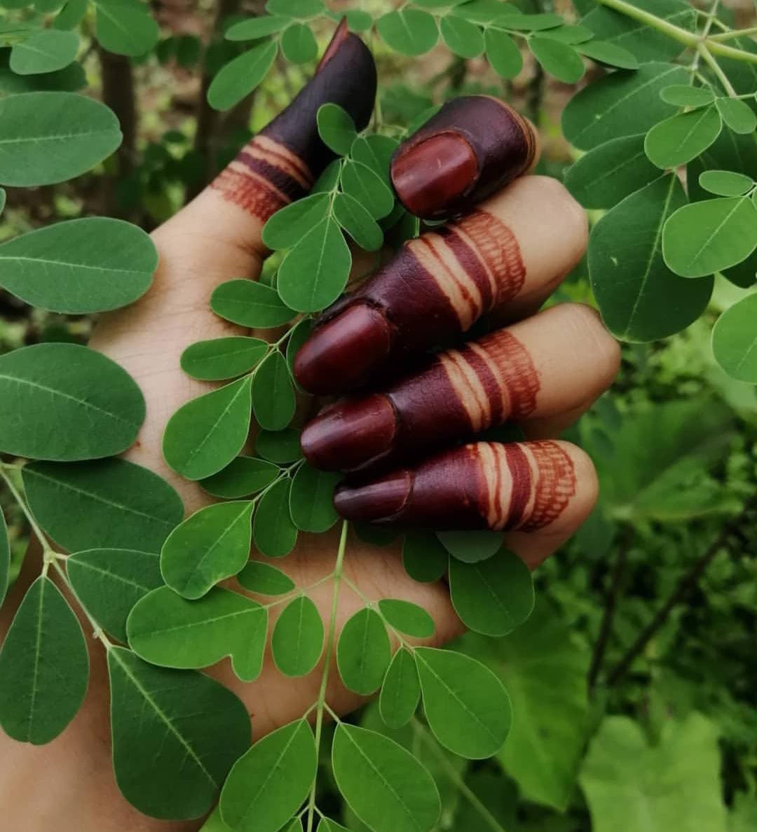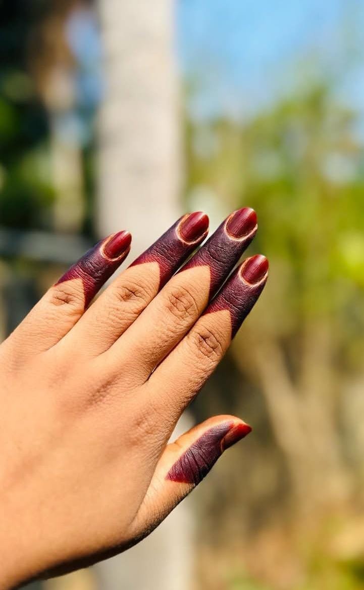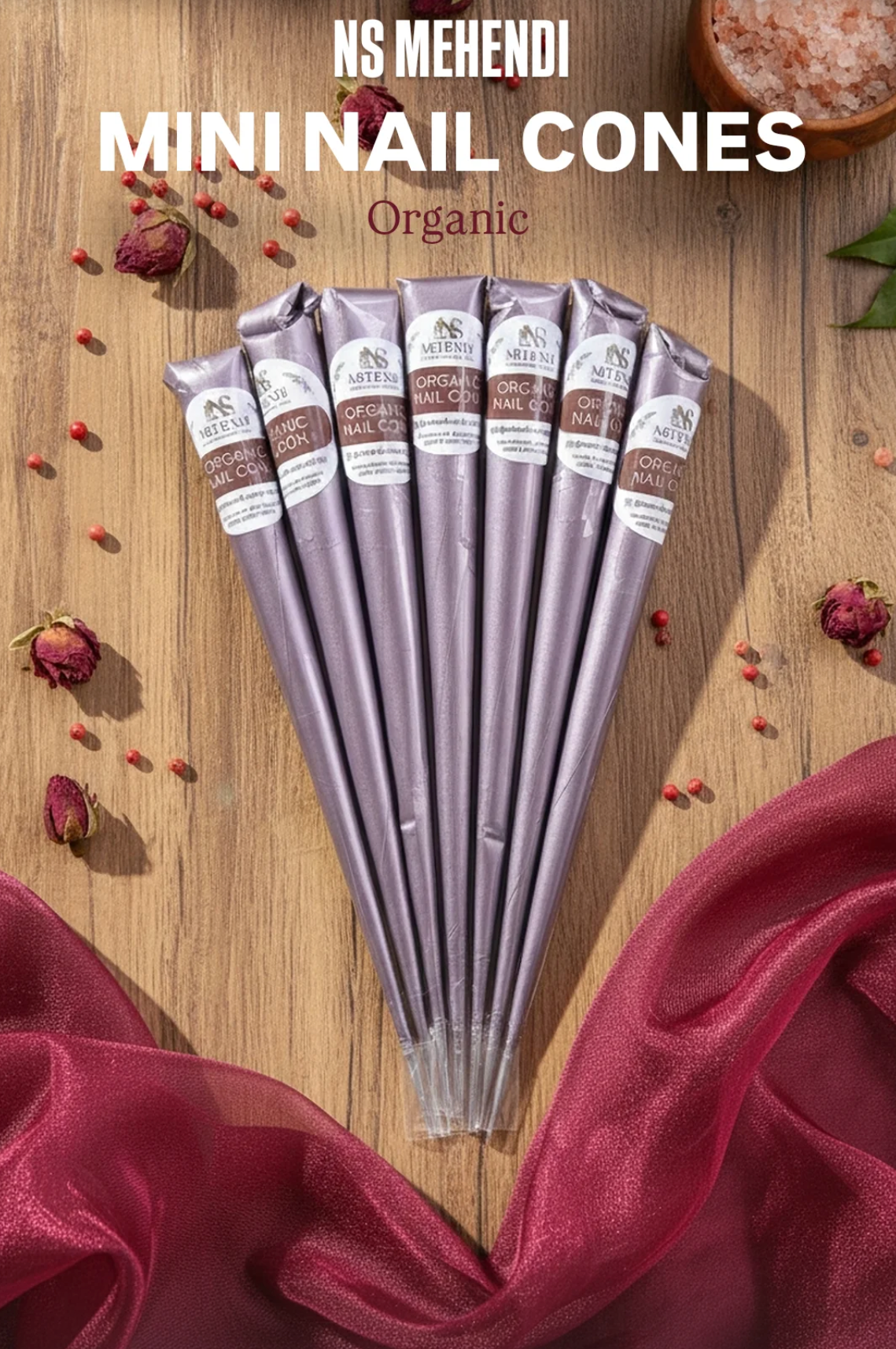 3️⃣ For nails, use NS Mehendi Premium Nail Henna Cones directly on nails. Leave overnight for a rich dark maroon nail stain in just one application.