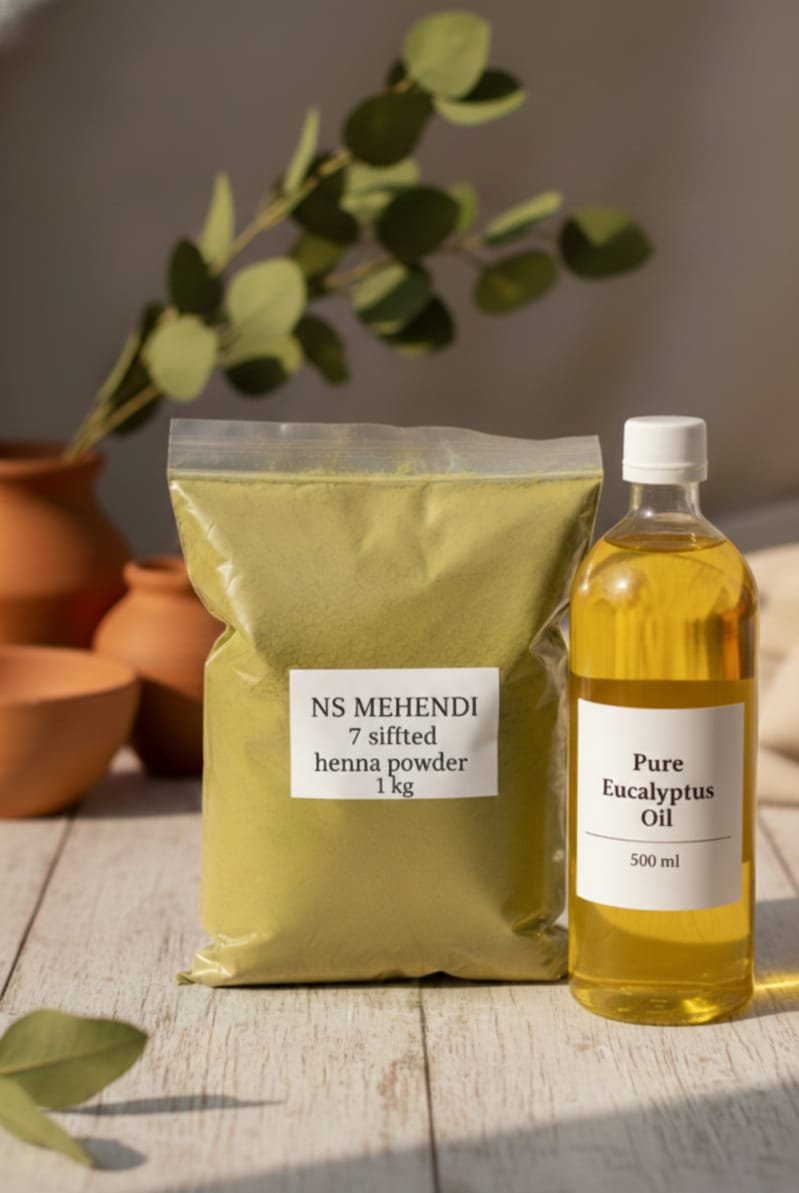 The Henna Combo Pack 1kg – Eucalyptus is designed for mehendi artists, salons, and regular users who prefer preparing henna paste using pure eucalyptus oil. This pack offers sufficient quantity for large-batch paste preparation and continuous mehendi work.