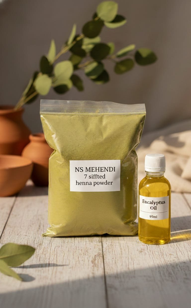 The Henna Combo Pack (Eucalyptus) is designed for those who want essential henna ingredients in one convenient pack. Ideal for paste preparation, practice, and regular mehendi use.