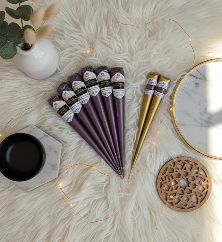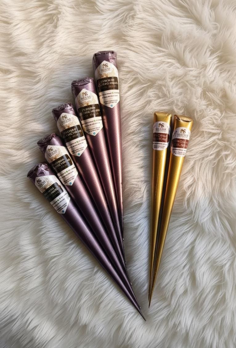 Our Premium Henna Cones (Pack of 6 + 2) is a thoughtfully curated combo designed for smooth mehendi application, fine detailing, and professional results. This pack includes 6 organic henna cones for main designs and 2 big nail cones for bold lines and detailing.